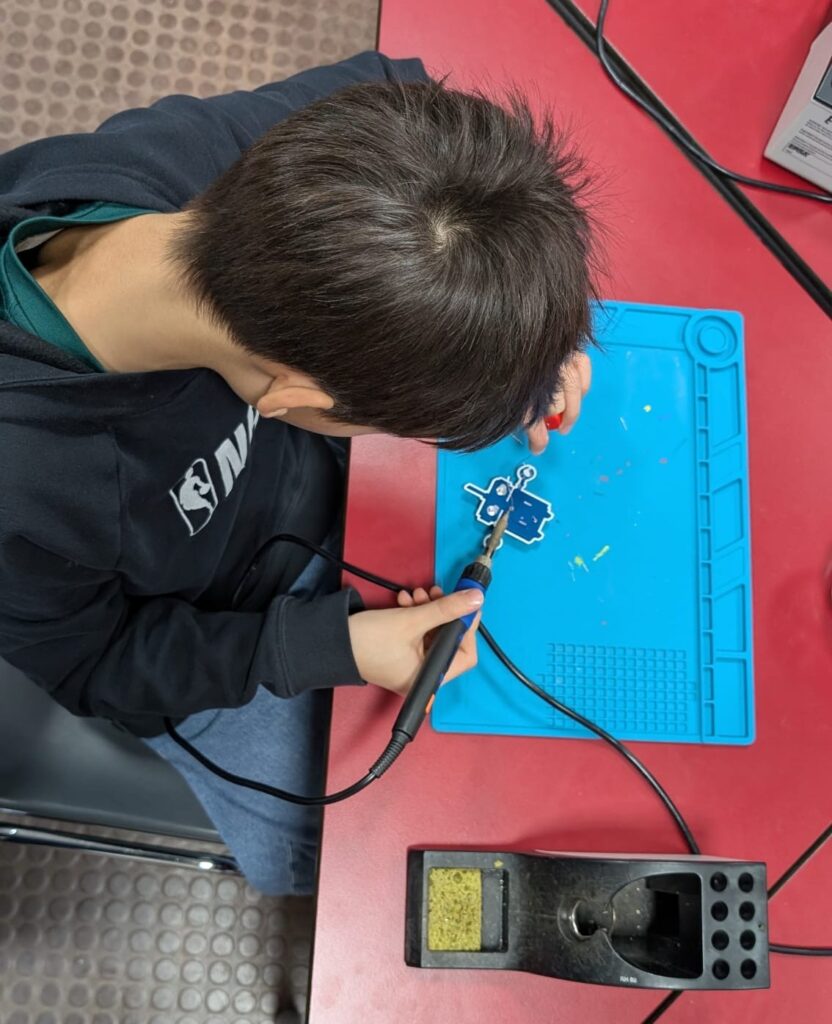 Ein weiteres Highlight war das Löten eigener LED-Motive-Platinen. Aus einfachen elektronischen Bauteilen entstanden bunt leuchtende Kunstwerke. Dabei sammelten die Kinder erste praktische Erfahrungen rund um Elektronik und Stromkreis – und waren sichtlich stolz, als ihre selbst gelöteten Platinen zum ersten Mal aufleuchteten. Natürlich durften auch diese mit nach Hause genommen werden.